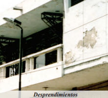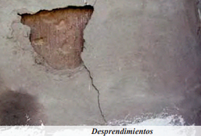 Desprendimientos:Es la separación del material de revestimiento de la superficie por pérdida de adherencia ocasionada por la presencia de agua que hace que el agente intermedio de sujeción de los dos materiales pierda sus cualidades y permita que el revestimiento se desprenda o por el aumento de volumen a causa del agua que al helarse o por cristalización de sales lo produce; puede ser incipiente o puede ser definitivo. Los diferentes tipos de desprendimientos que se produzcan en recubrimientos dependerán del sistema constructivo de acabado, del material constitutivo de sus elementos y del sistema de adherencia o de sujeción al soporte; igualmente, las causas indirectas dependerán de cada sistema de acabado. El desprendimiento por la falta de adherencia de las piezas de alicatado se caracteriza por afectar a importantes superficies. Suele presentarse en embaldosados adheridos con gruesas tortas de mortero hidráulico o cemento rápido.