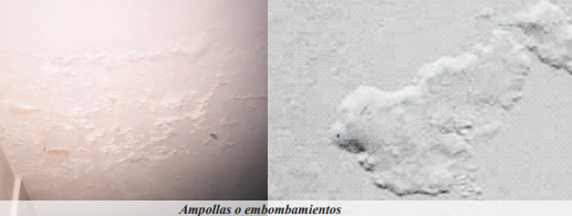 Ampollas o embombamientos:Vejigas formadas en la epidermis producidas por el aire o por la humedad contenida en la superficie que ejerce presión para salir, reacción expansiva que genera embombamientos o abolsamientos en la zona inmediatamente situada bajo la superficie. Las ampollas consisten en un hinchamiento parcial de la pintura, que se produce en varios puntos y con diferentes tamaños. Esto no afecta para nada su resistencia mientras no llegue a romperse. Generalmente las ampollas se forman en pinturas resistentes y flexibles, aplicadas sobre un soporte inadecuadamente preparado. Su aparición puede obedecer a humedades internas que afloran a la superficie del paramento en donde no pueden evaporarse y quedan atrapadas en la capa elástica de la pintura, la presionan y forman las ampollas.