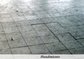 Hundimientos: Acción o efecto que se presenta en la superficie producto del asentamiento del suelo o terreno por una consolidación mayor a la inicial ante la presencia de agua que hace que el material base se compacte y por lo tanto se hunda; cuando se presentan hundimientos se generan desprendimientos del material de revestimiento. El agua que cae gota a gota va mojando la superficie, poco a poco va penetrando en ella, empapando los morteros, se va extendiendo por capilaridad y envuelve en una atmósfera de humedad caliente que produce los citados efectos de hundimiento en breve plazo. Esta patología tiene varias fuentes, una puede ser por filtración, otra por rotura de tuberías de agua potable o de aguas servidas, o por el agua producto del aseo y limpieza de la edificación, todas ellas en el tiempo saturan los pisos, tanto los materiales de acabado, como los de sujeción y soporte, penetrando hacia el suelo, que dependiendo de sus características facilitará que se presente el hecho