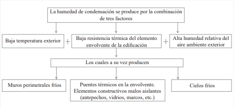 El aire siempre contiene vapor de agua y puede mantenerlo en este estado, lo cual depende de la temperatura ambiente y de la temperatura de la superficie que entra en contacto con el aire. El aire interior de la edificación generalmente contiene más humedad que el exterior; a medida que el aire incrementa su humedad relativa, mayor es el riesgo de que ésta se condense. En los cerramientos, como consecuencia de la condensación del vapor de agua que está en el interior de los mismos, en su recorrido de ambientes con mayor presión de vapor (normalmente los interiores) hacia los de presión de vapor más baja (los exteriores), el agua pasa de estado gaseoso a líquido, estableciéndose de esta manera una corriente de dicho vapor de agua que depende de la permisividad de los materiales, que va desde uno (cuando la barrera no existe) hasta cero (cuando el material es impermeable).