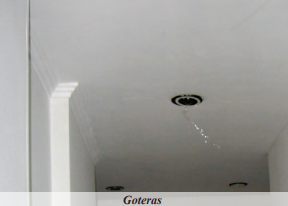 Las goteras implican una corriente de agua permanente que provoca daño progresivo en los elementos que compromete. El caso más común se debe a una filtración en el techo, por un defecto en la impermeabilización del mismo. Una rotura de la lámina impermeable o el despegue de sus bordes, abren una vía de entrada fácil para que el agua llegue hasta el interior de la edificación. Si el fallo se origina en un piso intermedio de ésta, lo más seguro es que la filtración se deba a una rotura en las canalizaciones de agua del piso inmediatamente superior. Las goteras pueden obedecer a varias causas pero por lo general se deben a desorganización del tejado o a rotura de algunas tejas. El agua de lluvia que corre por el faldón, al encontrar una abertura o una grieta penetra por ella y se va filtrando a través de la fábrica de la armadura y del suelo y cae gota a gota en el piso siguiente.