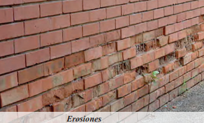 Erosiones:Depresiones o rebajamientos producidos en la superficie de un elemento constructivo por el roce con otro o por la acción del agua que cae o circula sobre él generando desgaste sobre su superficie; la erosión es un proceso lento y continuo y está asociado a las características y propiedades del material. En los granitos y en las areniscas se presentan procesos de arenización en los primeros y de disgregación en las segundas, por lo general estos son superficiales, debidos a la pérdida diferencial de algún componente mineralógico. La arenización se debe a la meteorización de los feldespatos, los cuales son eliminados con facilidad, quedando sueltos los granos de cuarzo; Dentro de las erosiones pertenecientes a las lesiones producidas por la presencia de agua se reconocen dos tipos:las de origen químico y las de origen físico.